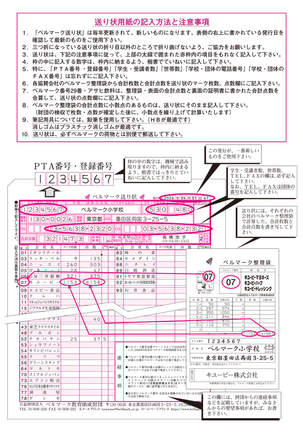 - 参加団体には年2回(4月と10月)、新しい送り状を送付します。表面の発行日を確認して最新のものを使ってください。お手元にない場合は、ベルマーク財団に請求してください。