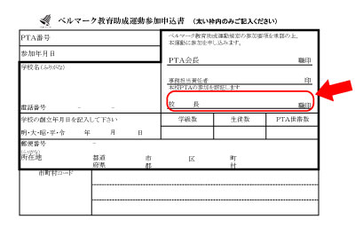 申込書には学校長の「職印」が必要です。個人印ではなく、学校に保管してある職印を押してください。PTA会長印も、職印として作ってある学校はそれを使ってください。