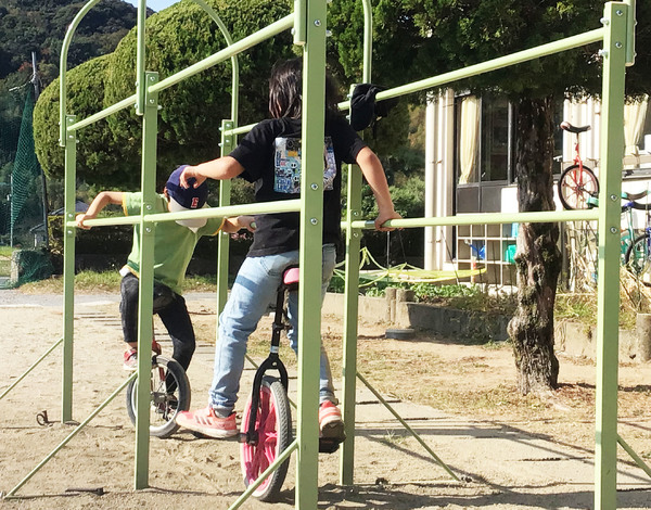 同校が希望したのは、一輪車の練習用手すりとノンスリップカラーマット。3校それぞれにあった一輪車を足すと、30台にもなりましたが、「練習環境がなく残念に思っていた」と話すのは荒木茂先生。手すりを設置すると、子どもたちは早速、体育の授業や休み時間に使い始めました。「特に低学年は習得が早く、みるみるうちに進める距離を伸ばしている」といいます。カラーマットも、追加で欲しいとちょうど思っていたところだったそうです。
