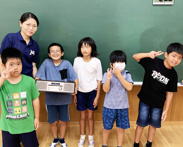 今回財団が贈ったのは、CDラジカセ、CDポータブルシステムなどです。これによって、各教室に置くことが出来たといいます。「朝の会や教科の教材などで使い、重宝しています」と砂川栄作教頭は話しました。