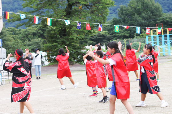 多那小・中では、地域の方々との交流が活発です。運動会は、保育園の園児や地域住民も参加して開催しています。ほかにも、老人会15人の方々とのグランドゴルフや、JA婦人会の方と花壇に花を植えたり、群馬県や栃木県の代表的な盆踊りの歌である「八木節」を一緒に踊ったりなど様々な活動があります。