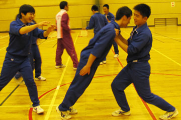 実技に戻り、新聞紙を胸の前に置いて、腕、足ばかりでなく体幹を使って走るトレーニング。正しい姿勢で走ると新聞紙は落ちません。その格好でリレーをし、しっかり腕を振っているかチェックしました。
