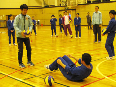 ウォーミングアップを済ませて体育館を数周走ってから2人1組になり、片足立ちの姿勢でバレーボールを横から投げるトレーニング。骨盤を使って投げるのがポイントです。また、齊藤コーチの掛け声に合わせて「こけし」走りの練習。骨盤、肩甲骨、姿勢の3要素の頭文字で、骨盤と肩甲骨を活発に動かし正しい姿勢でリズムよく走るためです。生徒も次第にうまくなりました。次はスライドを使って理論の学習です。