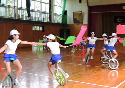 大分県竹田市の菅生小学校(28人)は、7月上旬に1人1台ずつ行き渡るように一輪車をそろえました。「少人数でも集団演技ができて、また、練習に応じた成果を体感できるのが、一輪車の良さだと思います」と魅力を語るのは、自らも練習をしたことのある宗岡良子校長。「子どもたちは今、スイスイとまではいきませんが、スイス止まりくらいの状況なので指導をお願いしました」と茶目っ気たっぷりに話されました。