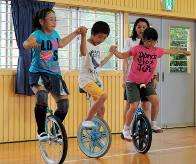 宮崎県諸塚村と大分県竹田市の2小学校で7月15、16の両日、ベルマークソフト援助事業の「一輪車講習会」がそれぞれ開かれました。いずれも講師は、国内外の一輪車競技大会で優勝経験のある小山美由紀さん(ユニサイクルなぎさ所属)と鈴木奈菜さん(江戸川一輪車クラブぴえろ所属)が務めました。乗れない児童は基本的な乗り降りの仕方を、乗れる児童は新しい技などを教えてもらい、「いろんな乗り方があってビックリ」「技をたくさん教えて」と目を輝かせました。