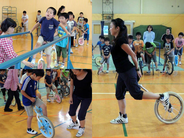 講習会は体育館で開きました。校長が「小山美由紀さんは小学校2年生に、鈴木奈菜さんは3歳のときに一輪車に乗れるようになったそうです」と講師を紹介すると、児童たちから驚きの声が上がりました。