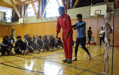 体育館で開かれた教室では、人間の骨格模型やひもを使うなどして、体幹と肩甲骨、骨盤を生かした効率的な走り方を学びました。走るには「こ・け・し」(「こ」は骨盤、「け」は肩甲骨、「し」は姿勢)が大切で、走るときの姿勢や重心のかけ方、腕の振り方によって体にかかる負担が全然違うことなどの説明がありました。生徒たちは熱心に耳を傾けました。