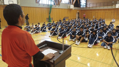 そのあと体育館に戻り、遠藤さんが箱根駅伝や五輪での体験を講演しました。「夢をかなえることはなかなか難しいけれど、夢を持たなければ、夢はかなえられない」と生徒たちに将来の夢を大切にするように語りかけました。