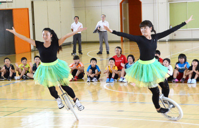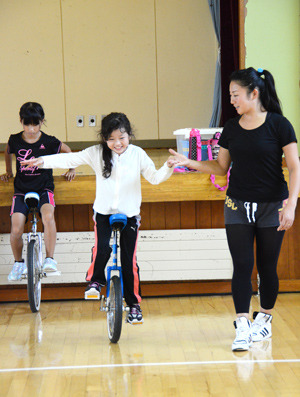 須郷さんは「きょうは結構、高度なこともやりました。いきなりできたら、天才です。何でもそうだけれど、あきらめないでね。頑張れば、きっといいことがありますから」と一輪車を続けてほしいな、という思いをあいさつに込めました。