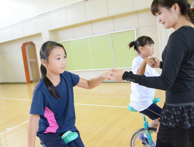 補助なしで乗れるクラスは、基本姿勢を確認し、後ろ向き走行や、跳び乗り、その場で一輪車を前後させる「アイドリング」、最後は手をつないで回転する「風車」から、向きを変えたり、手の下をくくったりといった高度な技にも、一人ひとりのレベルに合わせて試してみました。