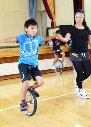 講習を受けたのは、体育の授業で一輪車を練習している3、4年生14人です。