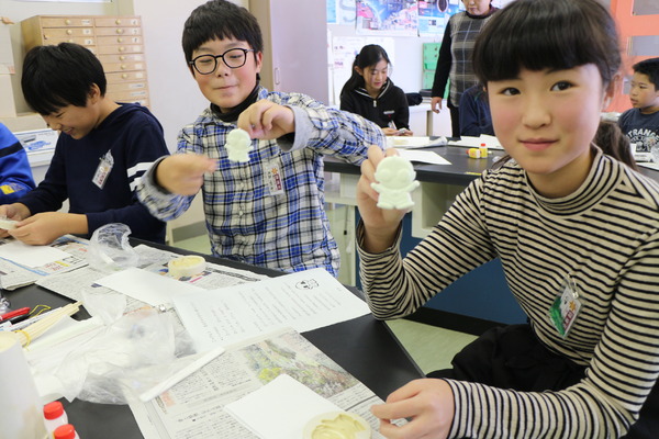 「混ぜるときは素早くね」「そうそう、とっても上手。静かに型に入れると気泡ができないのよね」。グループを回りながら丁寧にアドバイスする様子はさすがに元先生です。全員が大成功したのを見て、「みんなが100%成功できた学校は少ないですよ」。村上先生の言葉に、子ども達から拍手が起きました。