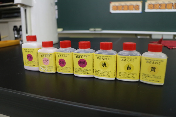 「風船のように膨らませてみましょう」。ストローをさしてそっと息を吹き込むと、大きく膨らみます。ベランダに出て太陽の光に当たるとピンクや紫に変わり、室内に入ると再び元の白色に戻ります。「え~なんで!? すぐ色が変わるね」と、子どもたちも外に出たり、入ったりして大忙しです。忍者絵の具は、正式名称「フォトクロミック紫外線反応インキ」というサングラスにも使われている成分です。