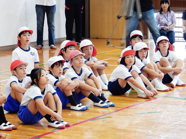 会場は修成小。校庭の真ん中に大きな楠の木がそびえているのが印象的な学校です。「5月の運動会で披露してからブランクがありましたが、今日の教室に備え、みんなやる気で練習してました」と修成小の清水聡美校長。午前10時まえには、周北小からもマイクロバスで児童たちが到着。全員体育館に集合し、いよいよ講習開始です。講師は世界大会優勝経験のある、おなじみの鈴木奈菜さんと須郷真弥さんです。