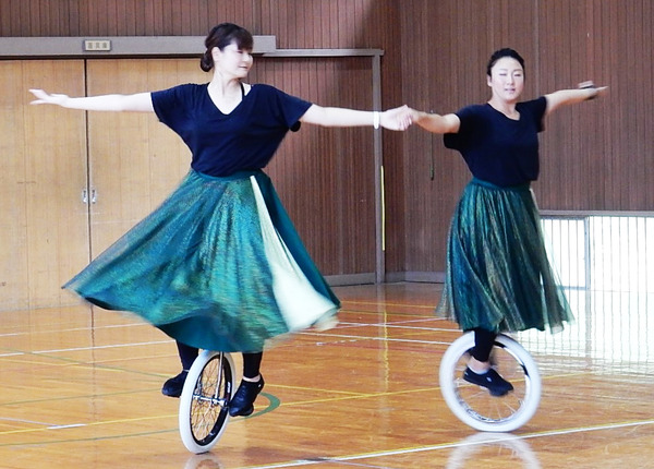続いてペアの模範演技。音楽に合わせた激しい動きと技の連続に、子どもたちはすっかり魅了されました。3分半の演技を終えた講師のお二人は、荒い息遣いで肩を上下させています。「一輪車は自転車のように休みながら進めないので、こぎっぱなしなんですよ」。