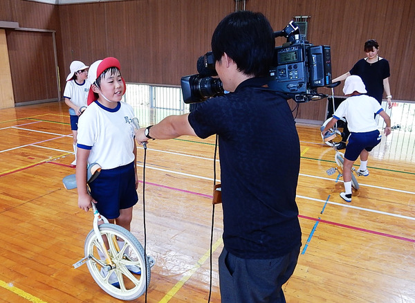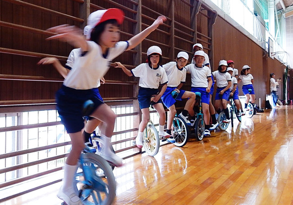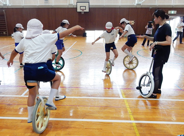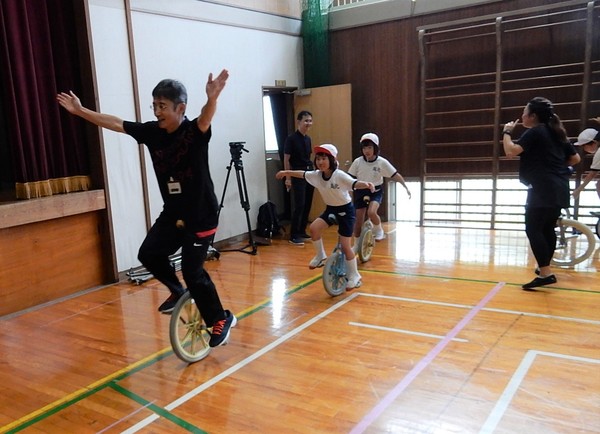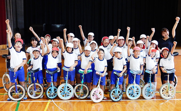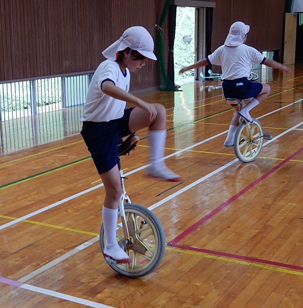 彼岸花があちこちで揺れる9月30日、山口県岩国市の西南にある市立修成小学校、同周北小学校の2校が一緒に一輪車講習会を受講しました。児童数は修成小が17人、周北小は7人。どちらも一輪車に積極的に取り組んでいる学校です。