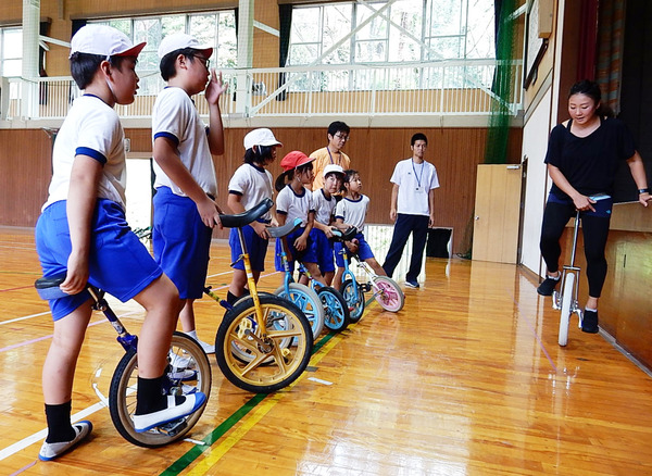 まずは技の紹介から。補助なし乗車、アイドリング、片足走行……。両校とも少々自信を持っている子が多く、「できる、できる!」との声が。「じゃあ、これは?」。片足走行中の須郷さんは、ペダルをこいでいない方の足を前方にすーっと伸ばしました。姿勢もよく、とてもきれいなフォルムです。「ええっー」と子どもたち。披露される技は次第に高度になっていき、自然と拍手がわき始めました。