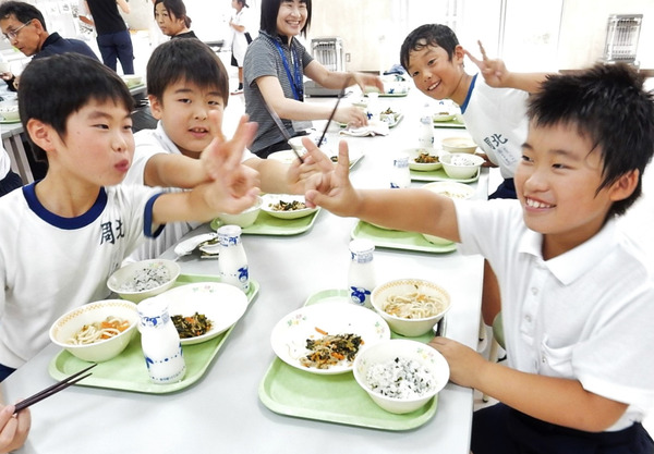 この日は給食も両校合同でした。当番の子がメニューにある小松菜の由来などを一生懸命に説明し、みんなで「いただきます!」。講習中とはまた違った笑顔がはじけました。