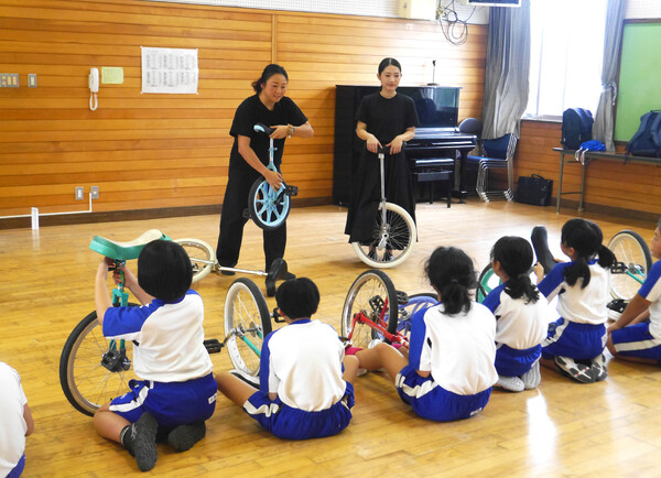 岐阜県高山市の市立岩滝小学校(石原啓悟校長、児童9人)は来年4月に閉校となり、市立東小学校(土師功嗣校長、児童358人)との統合が決まっています。ベルマーク財団主催の岩滝小の一輪車講習会は9月18日、東小で開かれました。岩滝小の児童を対象にした実技指導と、両校の児童を前にした模範演技の披露の2部構成となりました。