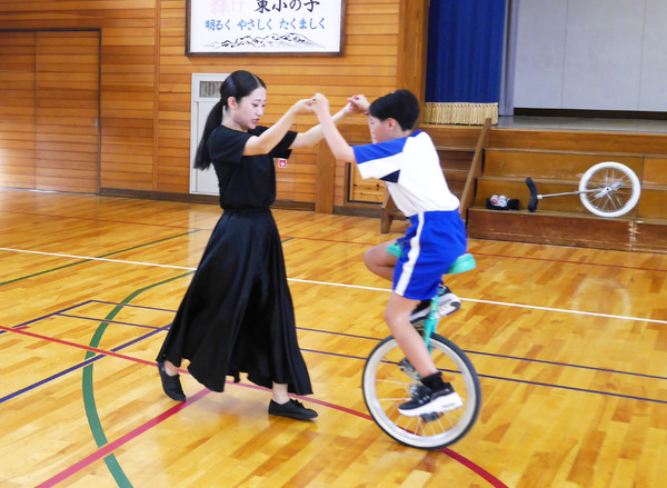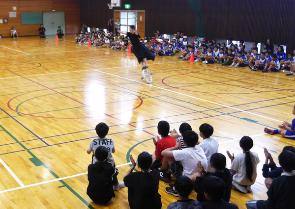児童の代表から「自分の足みたいに軽々と一輪車に乗るのがすごかった。もっとうまくなれるよう頑張ります」とお礼の言葉があり、講習会は終了。多人数の実技指導は難しいので、東小の児童たちには模範演技だけを見てもらうことにしていたのですが、見学だけでも今後の練習の刺激になったようです。