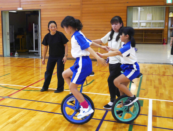 来年度から学ぶ学校を会場に/岐阜・岩滝小の一輪車講習会