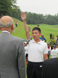 昨年の優勝チーム、東広島市立三ツ城小学校の6年生、神尾敦生(かみお・あつき)くんが選手宣誓。試合ではラフから見守る保護者をうならす鮮やかなショットが続き、今年は茨城県笠間市の友部小学校が優勝しました。