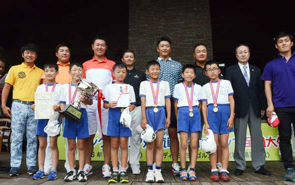 時折、霧雨のような小雨が降る中、ホールインワンが9人、アルバトロスが7人も出るハイレベルな大会を制したのは、スコア73の茨城県笠間市立友部小学校でした。キャプテンの羽沢和麿君(5年)は「監督、コーチ、保護者の皆さんのお陰です。昨年は補欠で悲しい思いもしましたが、優勝できてうれしい」と喜びを語りました。藤家幸司監督は「4、5年生中心なので正直、厳しいと思っていましたが、子どもたちが一生懸命頑張ってくれました」と選手をたたえました。2位は東京都大田区立池雪小(スコア74)、3位は宮城県大崎市立鬼首小(同75)でした。ドリームチームはスコア67と、貫禄を見せつけました。