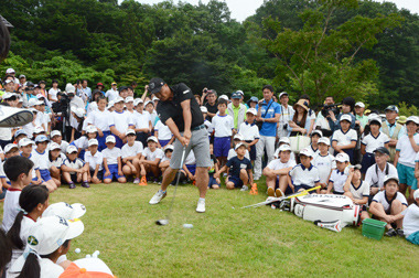 子ども向けに開発されたスナッグゴルフの全国大会「第14回JGTOカップ」が7月16日、福島県西郷村のグランディ那須白河ゴルフクラブで開かれました。日本ゴルフツアー機構(JGTO)、日本高等学校ゴルフ連盟が主催し、岩手・宮城・福島3県は招待、他は予選を勝ち抜いた、北海道から沖縄まで16都道県28小学校164選手が出場しました。6人のプロが特別参加し、初夏のグリーン上で青、黄、紫、緑とカラフルなボールでストロークを競い、交流を深めました。東日本大震災からの復興支援のため、昨年までの3年は宮城県、今年から3年は会場を福島県に移します。