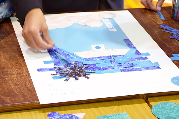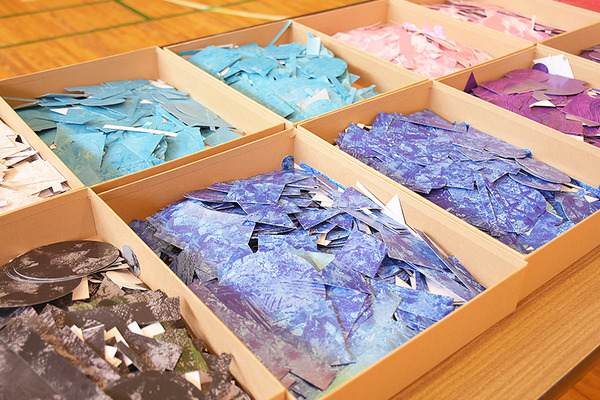 丸・三角・四角など、大きさや形、色の異なるパーツを組み合わせて年賀状をデザインします。教室は5年目を迎えますが、今回は唐桑中の生徒が初めて準備段階から参加。9月にあった事前授業で、パーツのもとになる色を決めるため、自分の手や木の葉、ビー玉、スポンジなどを使ってあえて色むらを作り、アクリル絵具で紙を染め上げたそうです。