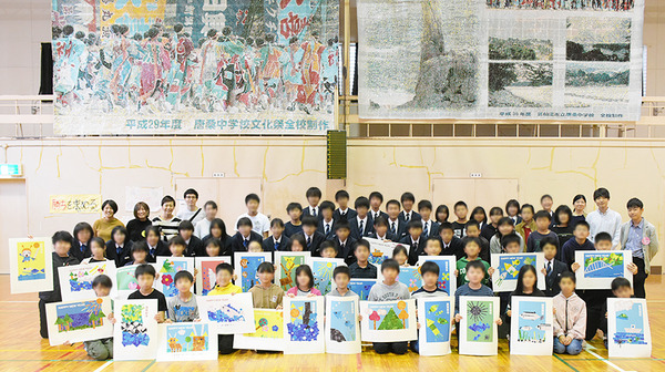 宮城県の気仙沼市立唐桑中学校(熊谷長悦校長)で10月31日、恒例の「チャリティー年賀状 デザイン教室」が開かれ、同中の2年生28人、唐桑小学校の6年生19人、中井小学校の6年生16人が参加しました。