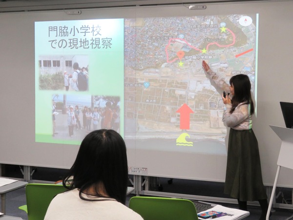 こうした事例を、全校児童の7割が犠牲となった石巻市立大川小学校のケースと比較しました。大川小はすぐ近くに山があり、避難するための「時間・情報・手段」はそろっていましたが、学校の危機管理マニュアルには避難先は明示されておらず、教員間の共通理解もなかったことなどが原因となったそうです。ゼミ生は「教師は子どもの命を預かる存在。そのために、学校全体として、何をしなければならないか、一人一人意識することが求められる」と結論付けました。