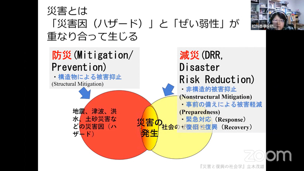 そもそも「災害」とは何かを考えるため、松川さんは「無人島で大地震が起きたら、『災害』と呼ぶ?」と問いかけました。無人島では人の生活に被害は出ません。つまり無人島では「災害」は発生しないのです。