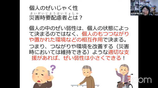 松川さんは、さらに質問を投げかけます。「家族と住んでいる車いすの人と、一人暮らしのめがねをかけた人、ぜい弱性が大きいのはどっち?」