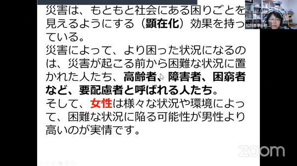 松川さんは、阪神・淡路大震災、能登半島地震、東日本大震災の、発生後の状況の移り変わりについても説明しました。高齢者、障がい者、経済的な困窮者などの要配慮者は、災害によってより困った状況に置かれることが多かったそうです。加えて、女性については「様々な状況や環境によって、困難な状況に陥る可能性が男性より高いのが実情」でした。