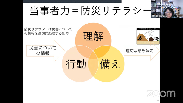 このような現状を改善するにはどうしたらいいか。松川さんは「みんなに出来ることは当事者力を高める、つまり防災リテラシーを高めること」だと訴えました。災害を正しく理解し、しっかり備え、行動できる自信を持つことが、防災リテラシーの向上につながります。
