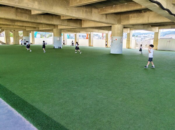 仮設校舎の建設で校庭が手狭になり、高床式の体育館の1階部分にも人工芝を敷き、運動スペースに使っています。広い場所をとらずに体を動かせる遊具は、児童たちに喜ばれていました。