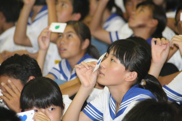 まずは分光板で光を覗いてみる。虹の七色に分かれて見えます。ここまでは生徒たちも「想定内」。でも、白熱灯、蛍光灯、LEDと、ライトの種類によって分かれる光の色や数が違うことを知るにつれて、ざわめきが波のように広がっていきました。同じ絵柄を撮った赤と緑と青のスライドを重ねるとカラーの映像になる。カードに描かれた絵をじっと見つめて突然裏返すと、裏の白い紙の上に補色の残像が残る????。暗くした体育館の中で次々と光のマジックが繰り広げられていきます。そしてある加工をした液晶ディスプレーでの実験。何も映っていない画面を、カードの偏光板を通して見たら、おやおや、テレビでおなじみのキャラクターが現れました。外の光が入らないように締め切った会場の暑さもなんのその、生徒たちは目の前で起こった不思議に熱中していました。