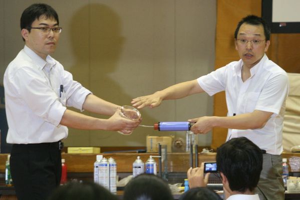 気圧に続いては燃焼の実験です。水素だけを燃やしたり、水素と酸素を混ぜて燃やしたり。会場の先生や生徒も前に出て実験に参加します。濡らした手の平の上に水素と酸素でシャボン玉を作り、それに近づく火。ボッと炎が上がって爆発しますが、手の平はやけど一つない。一瞬静まり返った会場からは、ドッと拍手と歓声が上がりました。