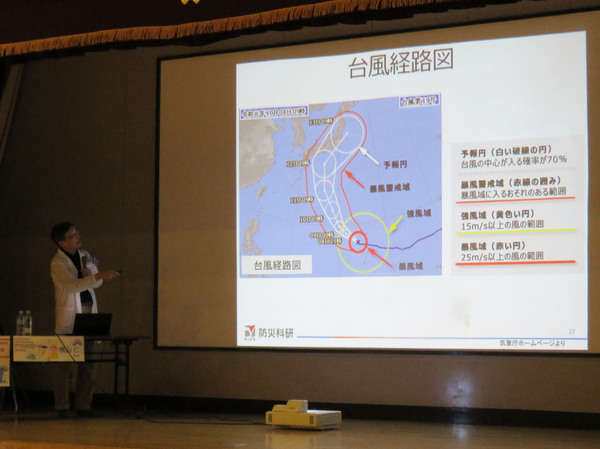 次に横山さんが映したのは大きな渦を巻く雲の写真。約1ヵ月前に日本列島の東を通過した台風22号です。教室を開催したこの日のニュースでは、台風26号の進路が報じられており、タイムリーな話題でした。
