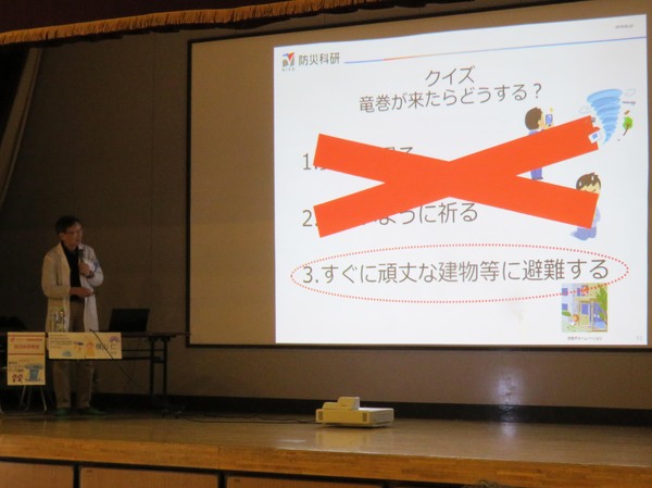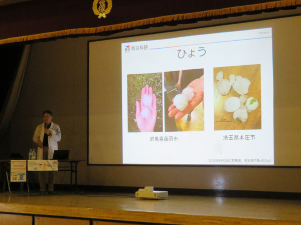 大雨が降る予兆となる積乱雲、近年ニュースで取り上げられることの多い竜巻やひょうの写真や映像も映し出されました。住宅地を大きな砂ぼこりがうねりながら移動する竜巻の怖さに、子どもたちの表情がこわばります。横山さんは「竜巻やひょうには前兆がある場合が多く、例えば急に冷たい風が吹いてきたりしたら要注意。頑丈な建物に避難したり、カーテンを閉めたりすることが重要です」と説明しました。