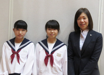 | 日立市立坂本中学校 発表した日立市立坂本中学3年の渡辺美和さん(中央)と久保田明日香さん(左)。右は谷田部由実子教頭 |