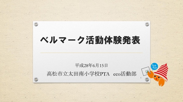 高松市立太田南小学校PTA eco活動部の 亀山、川添、田上 と申します。本日は、本校のベルマーク活動について、児童が取り組むベルマーク委員会の活動とともに昨年度の実績を交えて紹介させていただきます。