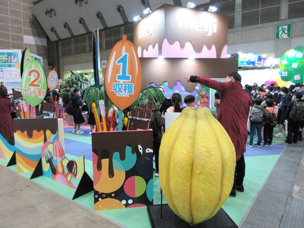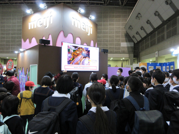 展示会でひときわ存在感を示していたのは明治のブースです。約20年にわたりカカオの原産国を支援する活動を行ってきた同社。カカオの実を収穫して豆になるまでの生産方法や、チョコレートの製造工程などを、模型やパネル、大型モニターを使って紹介しました。産地が抱えるさまざまな社会問題も学べる内容で、多くの小中高校生が訪れていました。