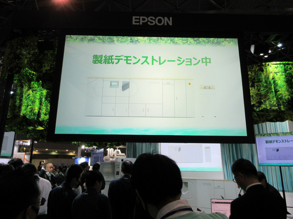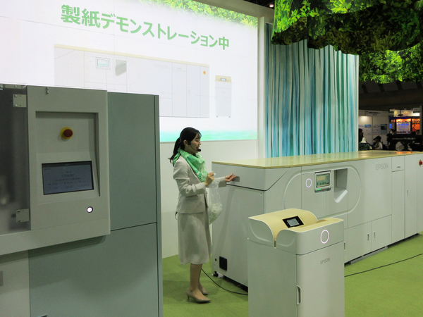 エプソン販売(エコプロ2023ではセイコーエプソンとして参加)のブースでは、乾式オフィス製紙機「新型PaperLab(プロトタイプ)」が公開されました。2016年に世界初の乾式オフィス製紙機として発売された「PaperLab A-8000」に比べて約半分の小型化を実現。2024年秋の商品化を目指しています。