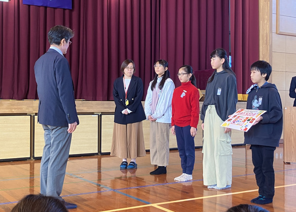 ダイレックスの五味肇社長から児童の代表にパネルを贈呈