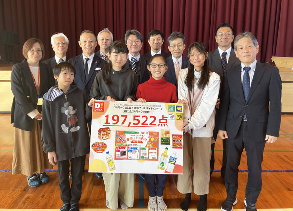 九州を中心にディスカウントストアを展開するダイレックス(本部・佐賀市)と、協賛会社のキリンビバレッジ(ベルマーク番号54)、湖池屋(同77)、日清食品(同35)が協力してベルマーク約19万7千点を集め、佐賀市内の小学校に寄贈しました。贈呈式が10月29日にあり、市内の小学校を代表して市立鍋島小学校の6年生の児童がマークを受け取りました。