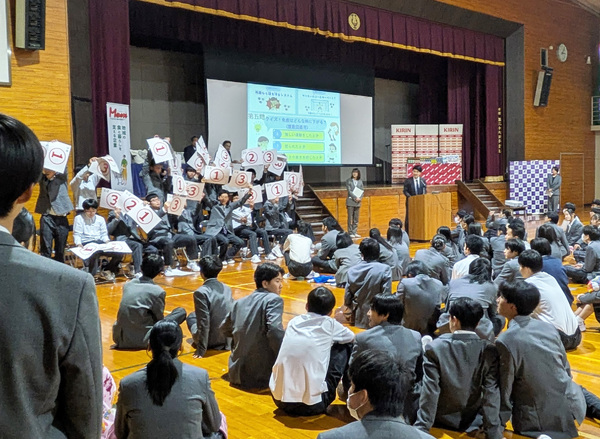 体育館で行われた贈呈式には全校生徒が参加。キリンビバレッジの小林雅敬・執行役員中部圏統括本部長が「キャンペーンでもオイスカ高校の活動の取り組みをしっかり紹介しており、たくさんのお客様の思いがベルマークに詰まっています。これからもキャンペーン、贈呈を行いたい」と話しました。
