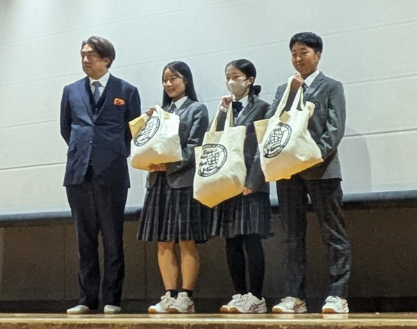 最後にタカラ・エムシーの上野拓社長から代表の生徒に「フードマーケットマム」のオリジナルマイバッグ三つにぎっしり詰まったベルマークが手渡されました。上野社長は「5年続けて、私もやる気が出ています。今後も取り組みを続けてください」とあいさつしました。岡本校長は「子どもたちが等しく学べるようにしたいという願いでは、本校が目指すものとベルマーク運動の目指すものは合致している。本校の活動にプラスして2社の寄贈をいただいた。これからも活動を発展させていきたい」と感謝を述べました。