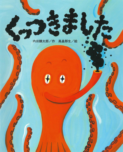 最初の見開きの左ページには、墨をはきながらあたふたと走っているタコの絵。右ページには、それを見てあわてたふうなダルマの絵。「タコとだるまがくっつきました」「だって/とってもすきでしたから」と書かれています。そして合体した二人は、「タコ・だるまちゃん」に。次はバラ、その次はしっぽというふうに、いろんなものとくっついて、その度に名前もくっついていきます。なんだかよくわからないけれど次のページが楽しみになる、内田麟太郎の世界。低学年の教室で読んであげたら、子どもたちが笑顔になりそうです。(低学年向き、1500円+税)
