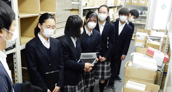 続いて倉庫へ。全国から届いたベルマークを保管してあるところです。たくさんの段ボール箱を前に、職員から「いま、ここにあるベルマークを全部足すと何点になると思う?」と問われた6人は、自信なさそうに「500万点くらい?」。正解は約3800万点でした。